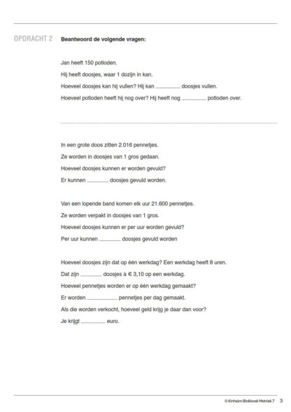 Er worden zakken met graan gevuld. In elke zak gaat zestig kilo. Ik heb duizend kilo. Hoeveel zakken kan ik vullen? Het zijn dit soort klassieke rekenoefeningen waar de reeks Metriek haar aanhoudende succes aan dankt! In de oefenboeken worden begrippen als tijd, lengte, gewicht en snelheid uitgelegd en met eenvoudige tekeningen verduidelijkt. Na de uitleg volgen korte, verhalende oefeningen waarmee de leerling met de verschillende eenheden leert rekenen.