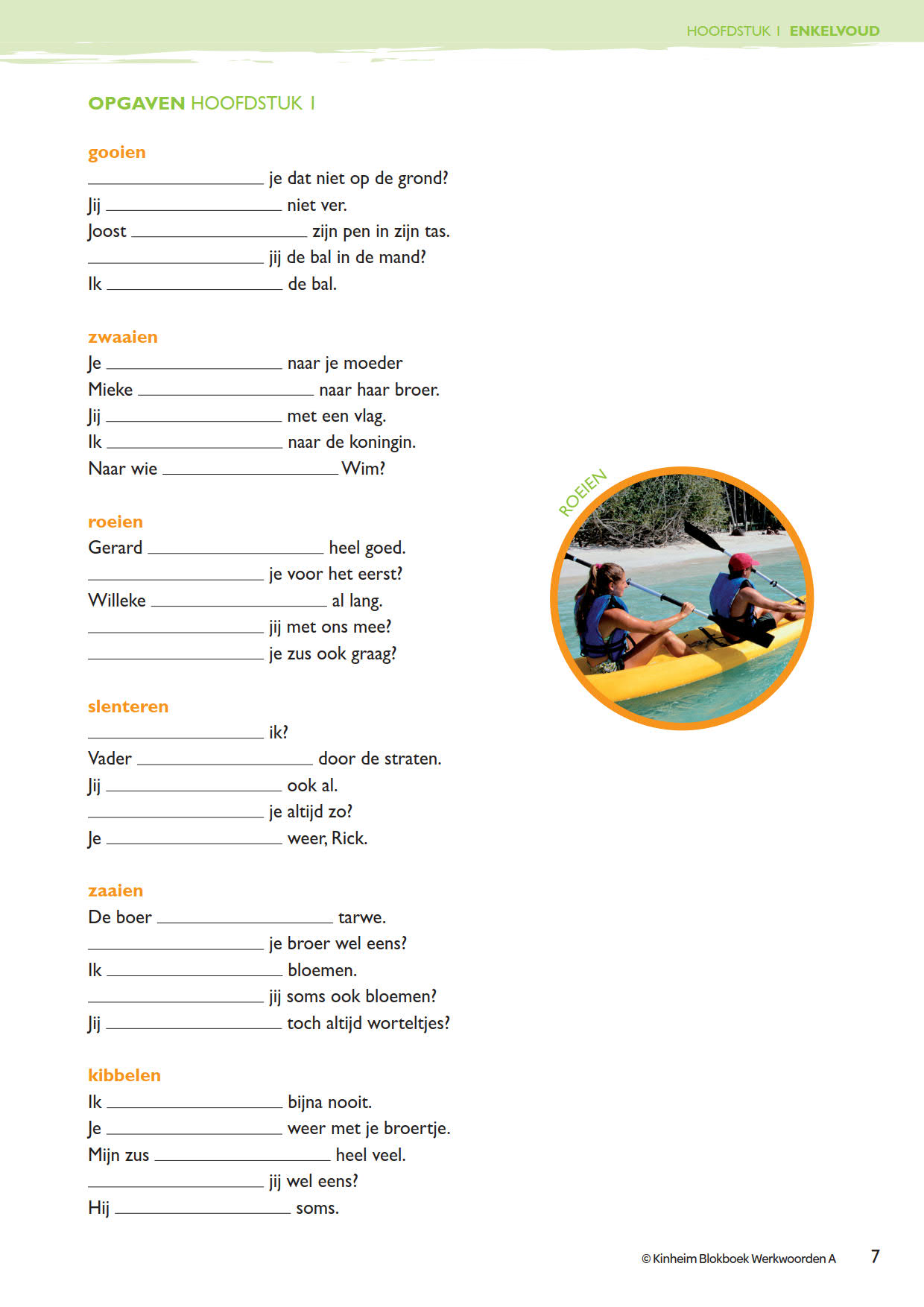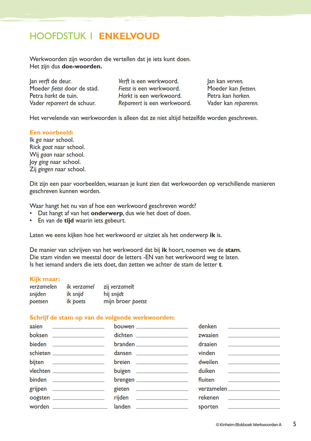 In Blokboek Werkwoorden A worden de stam en het gebruik van de stam van een werkwoord uitgelegd. Daarbij is er extra aandacht voor werkwoorden met een bijzondere stam waarbij een letter wegvalt, verandert of toegevoegd wordt. Ook de onregelmatige werkwoorden āhebbenā en āzijnā krijgen ruim aandacht in dit deel. In alle oefeningen wordt de tegenwoordige tijd gebruikt.