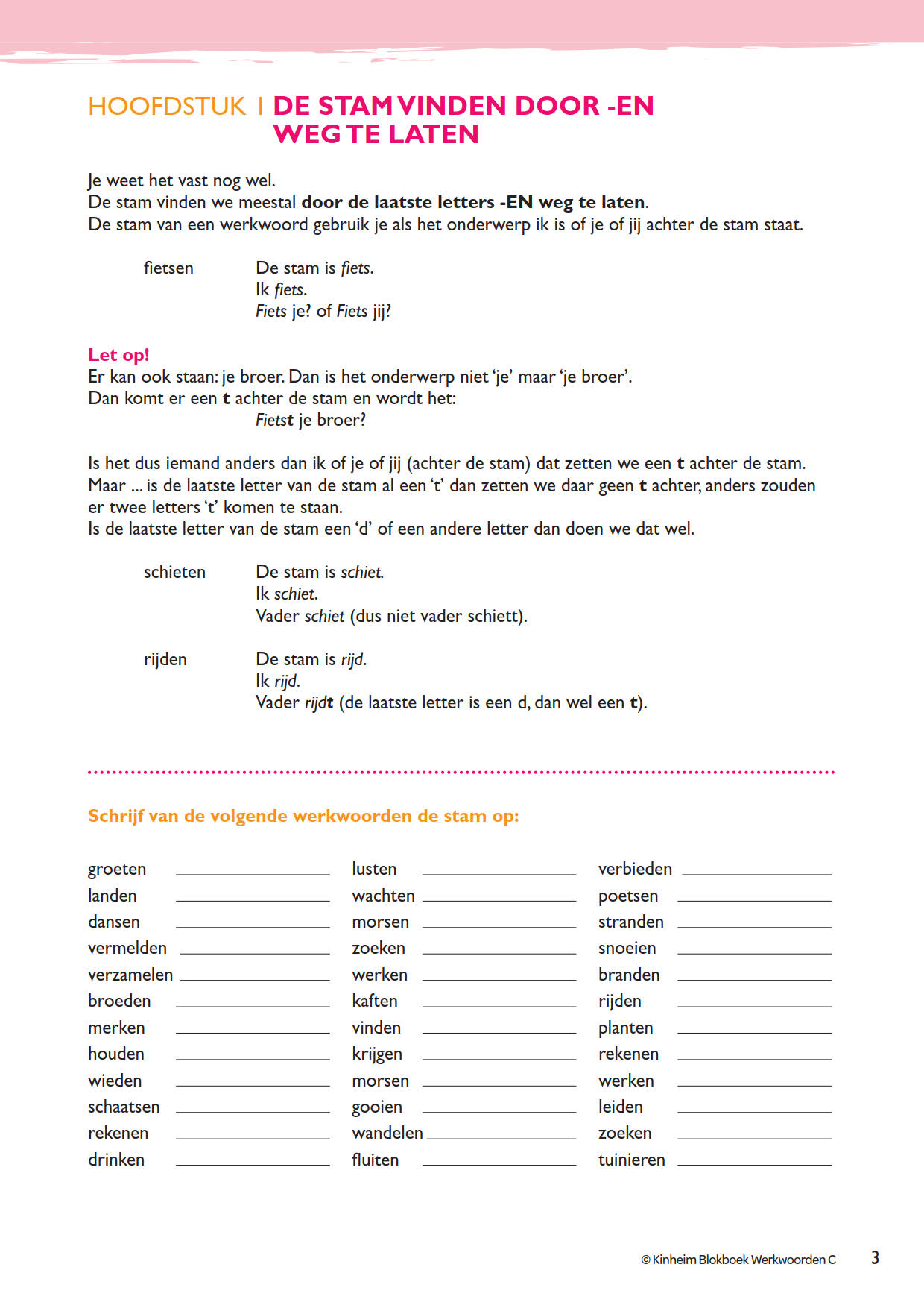Voor het goed leren vervoegen van werkwoorden moet er veel worden geoefend! Dat kan op een plezierige manier met de reeks Werkwoorden, drie fris en kleurrijk vormgegeven werkboeken waarin de moeilijkheden bij het vervoegen op een systematische manier worden behandeld. Elke moeilijkheid wordt kort en krachtig besproken en met voorbeelden verduidelijkt. Daarna volgen gevarieerde oefenopgaven, die klassikaal of individueel gemaakt kunnen worden. Door de vele herhalingsoefeningen krijgen leerlingen al snel meer grip op het gebruiken en vervoegen van werkwoorden.