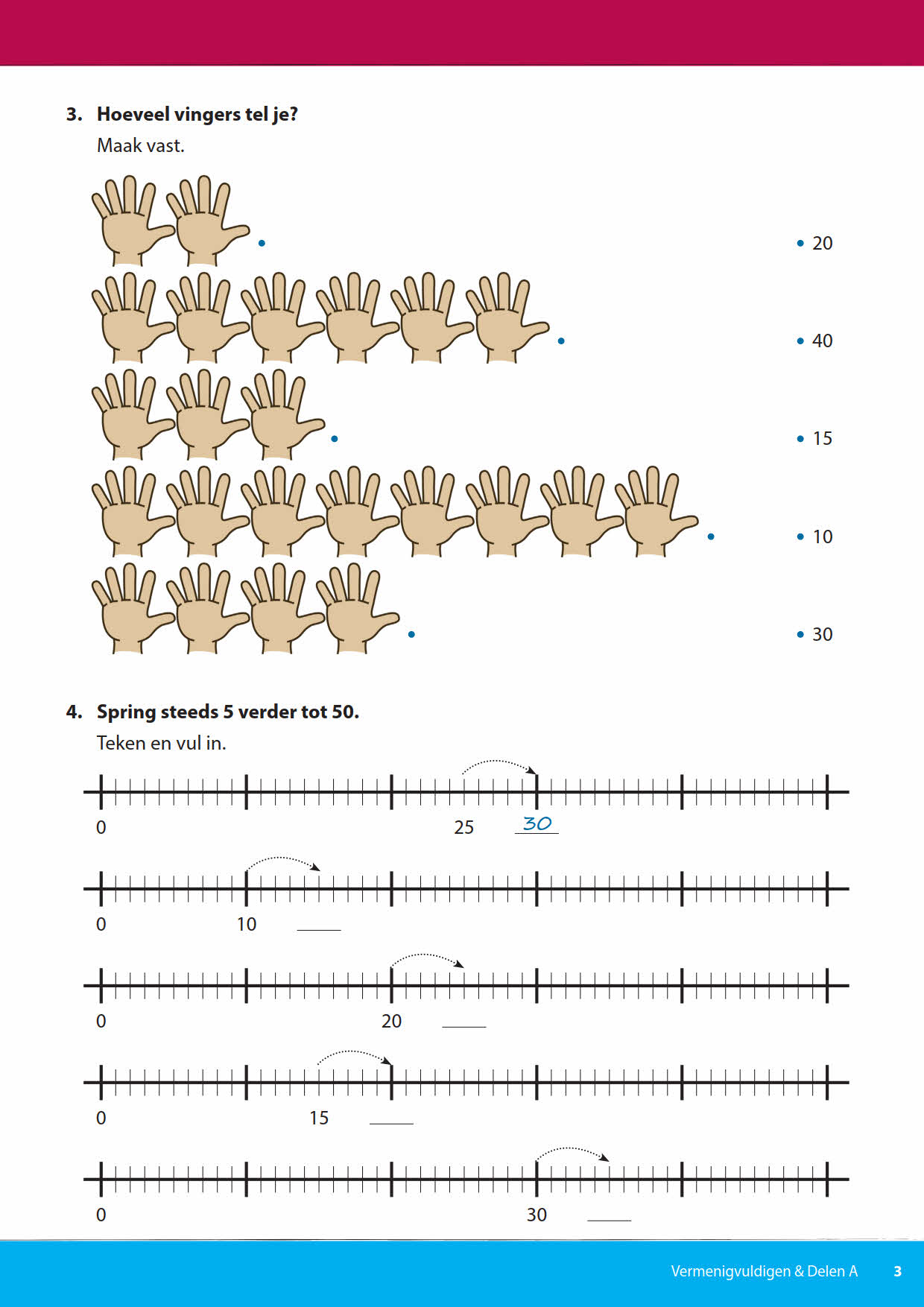 In het blok Herhaald tellen t/m 50 wordt gebruik gemaakt van onder andere huisnummers, handen en getallenlijnen om het herhaald tellen in stappen met 2 en 5 inzichtelijk te maken.