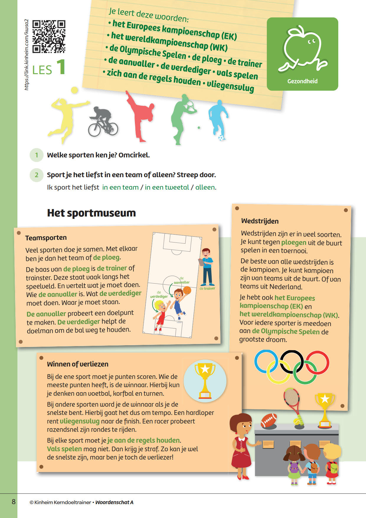 Een goede woordenschat is belangrijk. Het vormt de basis voor veel andere vakken, maar zorgt er ook voor dat een kind zich goed kan uiten. Gelukkig leren kinderen veel woorden incidenteel, maar er zal ook intentioneel woordenschatonderwijs moeten worden gegeven. Hierbij wordt op een gestructureerde en doelbewuste wijze gewerkt aan het uitbreiden van de woordenschat. Deze Kerndoeltrainer Woordenschat kan hierbij een hulpmiddel zijn. Daarnaast sluit deze serie aan op kerndoel 12. De opbouw van de lessen in deze werkboeken is geĆÆnspireerd op het Viertaktmodel met de fases: voorbewerken, semantiseren, consolideren en controleren.