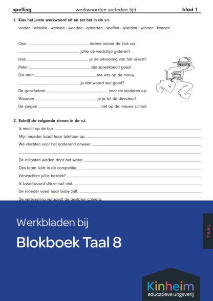 Werkbladen spelling voor groep 8 om te oefenen met werkwoorden verleden tijd, geselecteerd uit Blokboek Taal 8.
