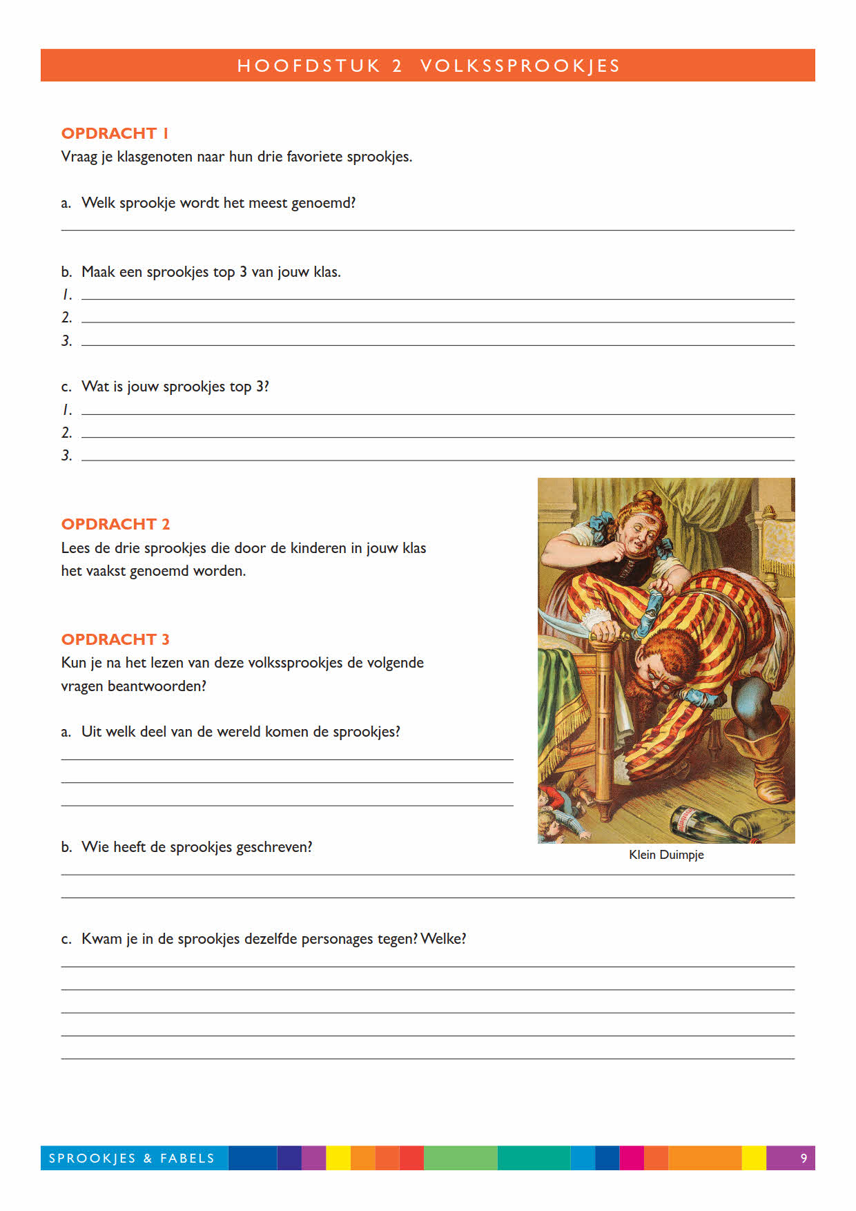 Met Werkgids Sprookjes & Fabels ontdekken leerlingen waar sprookjes vandaan komen, welke elementen ze gemeen hebben en wat hun verborgen boodschap is. Ook fabels, met een hoofdrol voor sprekende dieren en de moraal, worden onderzocht. De leerling leert bijvoorbeeld een Oudnederlandse fabel te vertalen en er zelf één te schrijven. Bij het hoofdstuk over illustraties wordt niet alleen een korte biografie over Anton Pieck geschreven maar neemt de leerling ook zelf de tekenset ter hand. De afwisselende opdrachten uit deze prachtig geïllustreerde Werkgids vormen samen een sprookjeswerkstuk, compleet met een zelf ontworpen omslag, een bronvermelding en een nawoord.